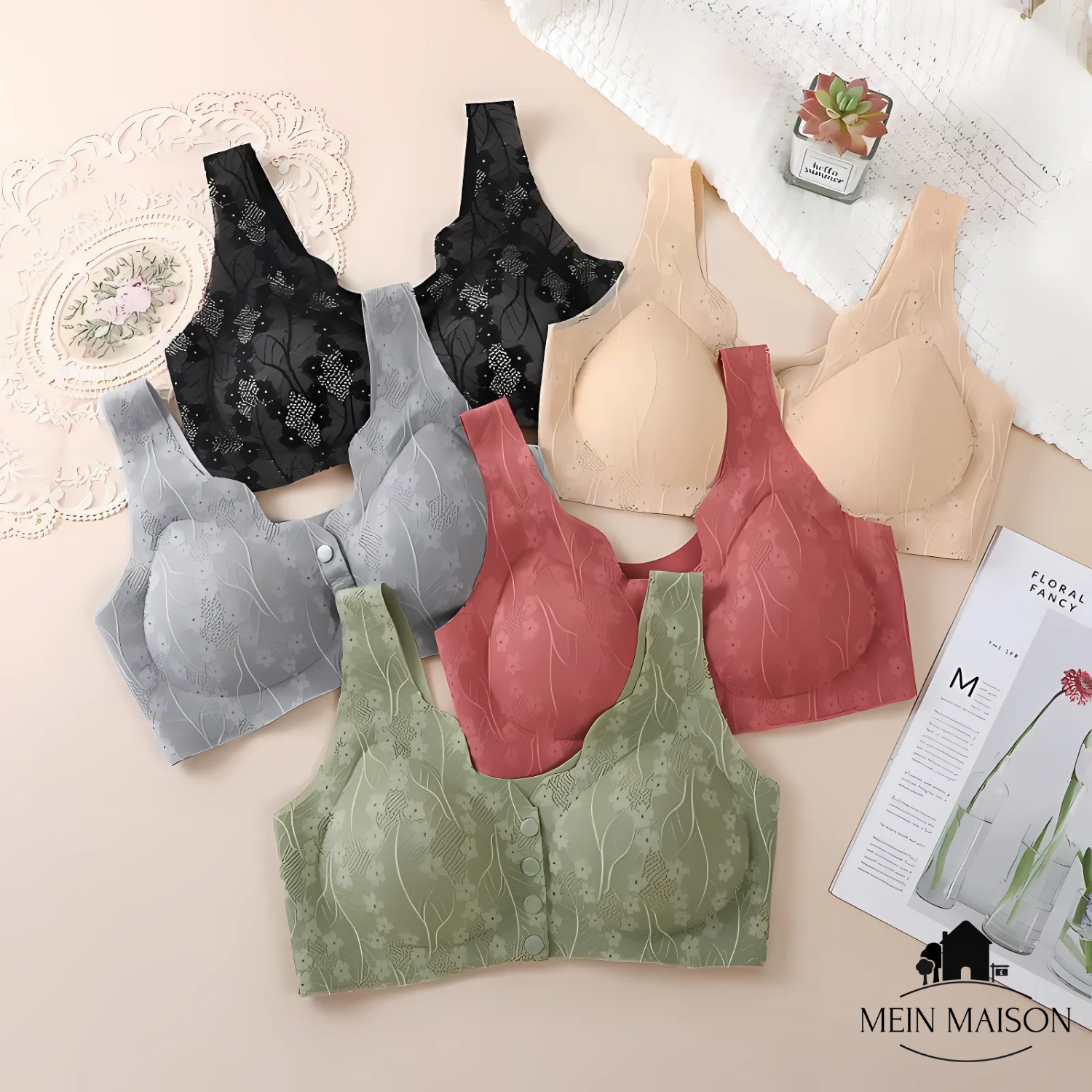 The CozyForm bra with convenient front buttons adapts perfectly to your figure and provides secure support without squeezing, pulling, or slipping. The breathable lace and thoughtful design offer exceptional comfort – ideal for long days, special occasions, or simply relaxing at home.